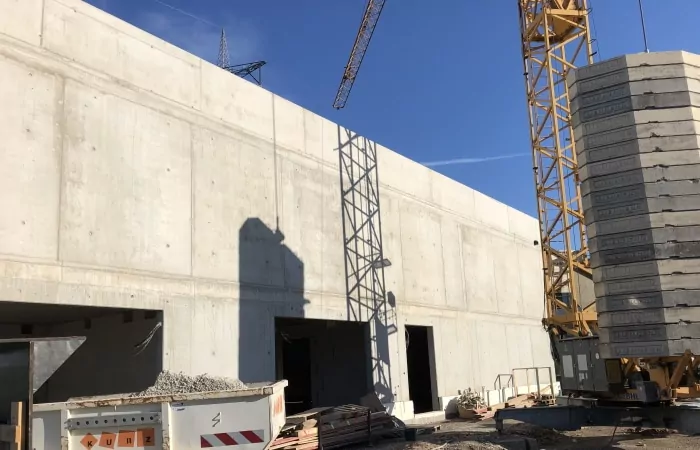 Gebäudegrundfläche ca. 27 x 28 m. Bei diesem Bauvorhaben handelt es sich um einen zweigeschossigen Massivbau. Die Wände, Böden und Decken sind in Stahlbeton und KS Mauerwerk geplant. Die Gründung wird als Flachgründung ausgeführt.