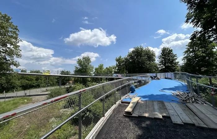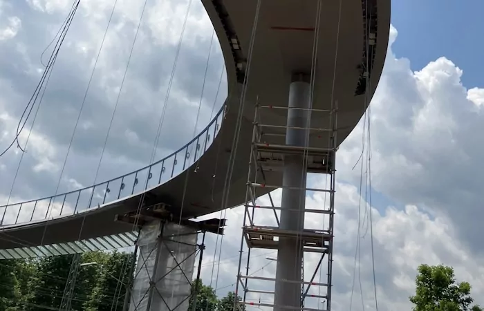 Schnell und sicher durch die Stadt: Dafür brauchen Radfahrende eigene Routen. Zur Erschließung neuer Radhauptrouten beauftragt die Universitätsstadt Tübingen den Neubau einer reinen Radwegbrücke zur Querung der Europastraße und der Gleisanlagen im westlichen Bahnhofsvorfeld, die Radwegbrücke West Derendinger Allee. Insgesamt 15 Montageteile wurden mit größeren Schwerlastkränen eingehoben. Die geschwungenen Stahlelemente wurden in Teilen geliefert und vor Ort zusammengeschweißt.
