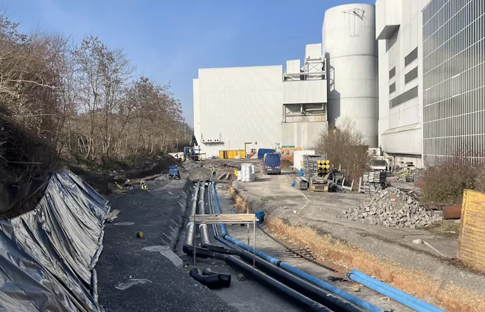 Für die Erschließung und Zufahrt zum Klärschlammheizkraftwerk muss die bestehende Werksstraße für den Lieferverkehr zum KHKW ertüchtigt werden. Hierzu ist ein Ausbau der bestehenden Asphaltstraße und ein Neubau in Asphaltbauweise notwendig. Im Bereich der Werksstraße sind ebenfalls Rohrverlegearbeiten für Misch- und Regenwasser, Trinkwasser, Prozesswasser und Löschwasser sowie für Nahwärmeleitungen und Kabelschutzrohre als Erschließung des KHKWs mit auszuführen. Die Länge der zu ertüchtigenden Zufahrtsstraße beträgt ca. 300m.
