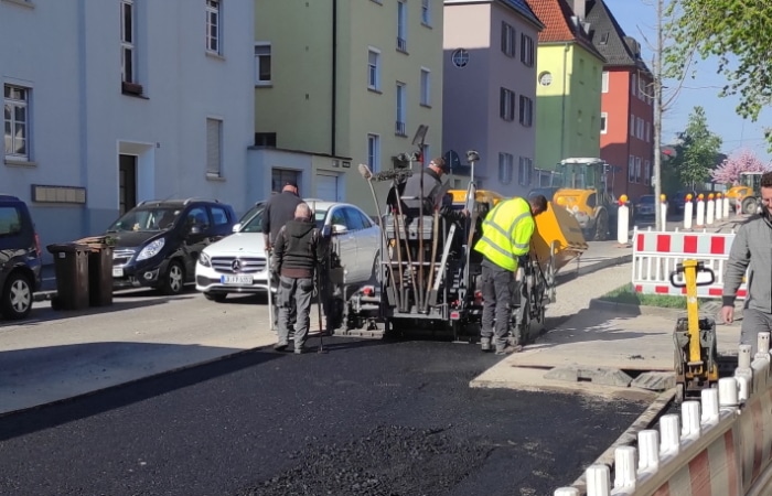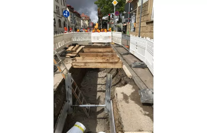 Tief- und Straßenbauarbeiten für die Neuverlegung von Fernwärmeleitungen bei halbseitiger Straßensperrung in Ludwigsburg.
